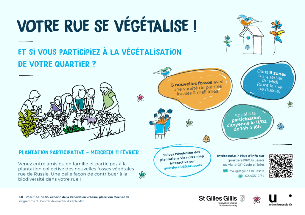 Et si vous participiez à la végétalisation de votre quartier ? Les services de la Rénovation urbaine, des Sports et de la Propreté de la commune de Saint-Gilles vous invite à prendre part à une action de végétalisation participative le mercredi 11 février 2025, de 14h à 18h, rue de Russie.